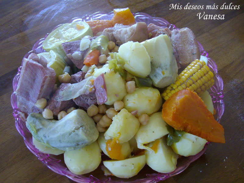 VERDURAS.-habichuelas atadas,calabacin o bubango,calabaza,zanahoria partida en vertical ,puerro,cabeza de ajos entera sin pelar ,col entera,papas,pimiento rojo,piña o mazorca maíz,sal gorda ,cucharada de oliva o pollo con piel,garbanzos .finalmente que cubra el agua todos los ingredientes y cuanto mas despacio hierva mejor .