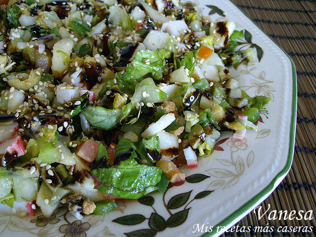 Picar todo los ingredientes en trocitos pequeñitos, y mezclarlo todo. Y aliñar con crema de vinagre balsámico.