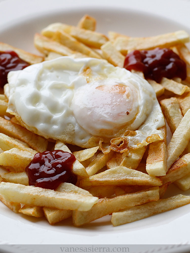 En una sartén pequeña o en la misma sartén que hemos freido las papas calentar 2 cm. de aceite, sin que llegue a humear. Cascar un huevo y con cuidado deslizarlo en la sartén. Con una cuchara echar aceite caliente sobre la yema mientras se cocina hasta que la clara esté cocinada y la yema cremosa. Retirar con una espumadera, escurriendo bien, y colocarlo encima de las papas. Repetir con los demás huevos que se quieran preparar.
