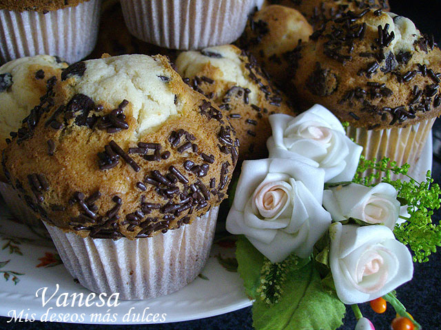 El truco para que salga con un copete grande la magdalena es poner las cápsulas de papel dentro de flaneras de metal. Echar la masa en las cápsulas de magdalenas y adornar con fideos de chocolate y en el horno lo pondremos 5 min. calor abajo solamente, luego 10 min. a 200ºC y por último bajé la temperatura a 175ºC durante 5 min.