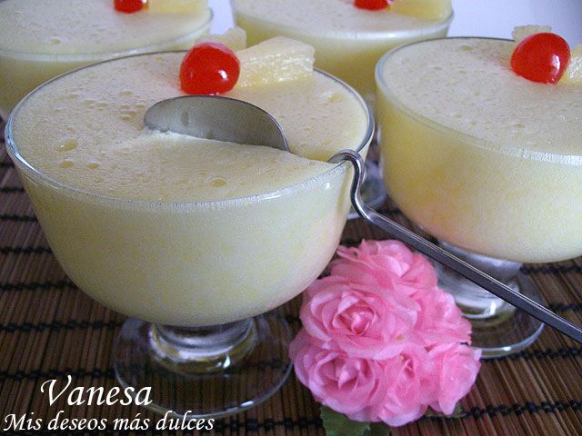 Este mousse es todo un descubrimiento, ya había hecho una mousse de fresa light y me pareció ¡buenísiiima!. Como me gustó mucho pensé prepararla de otros sabores, como por ejemplo ahora, de ¡piña!