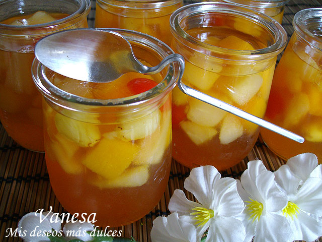 Abrimos las lata de frutas y ponemos todo el jugo en un vaso (no lo tiramos). Luego vamos repartiendo la fruta en vasitos de postre.