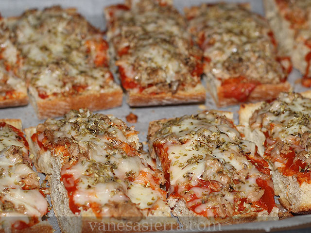 Abrimos el pan como si fueramos a hacer un bocadillo, extendemos un poco de tomate (en mi caso ketchup) sobre las rebanadas, añadimos el atún desmenuzado, el queso mozzarella rallado y espolvoreamos orégano por encima.