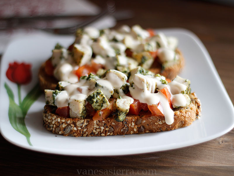 Cogemos un filete de pechuga de pollo y lo hacemos a la plancha, vuelta y vuelta hasta que esté listo. Mientras se vaya preparando el pollo, preparamos el tomate, lo cortamos en cuadraditos y lo aliñamos con aceite, vinagre, orégano y un poco de sal. Cuando la pechuga esté lista, la troceamos en cuadraditos y la ponemos encima de las rebanadas de pan, a continuación añadimos encima del pollo el tomate que hemos preparado y por último le ponemos un poco de salsa de mostaza y miel.
