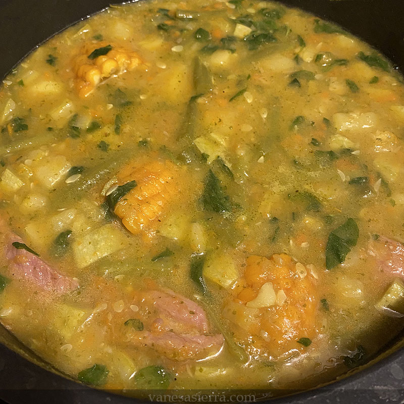 Lavamos, pelamos y troceamos la verdura en cuadritos. Añadimos al caldero la verdura que ya tenemos preparada: calabaza, calabacín (zucchini) o bubango, zanahoria y habichuelas. A continuación añadimos las piñas de millo y la costilla, ambas partidas en trozos.